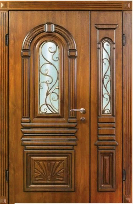 Поскольку в большинстве случаев устанавливаемые на входе в коттедж двустворчатые двери являются еще и предметом интерьера, украшающим здание, их дизайну предается особое значение. Эти двери, как правило, отделываются атмосферостойким МДФ, натуральным шпоном, массивом. Эффектно на таких дверях смотрится витражный узор, применение ковки, зеркальных элементов. Вариантов декора входной двустворчатой двери масса, тут все зависит от пожеланий заказчика.