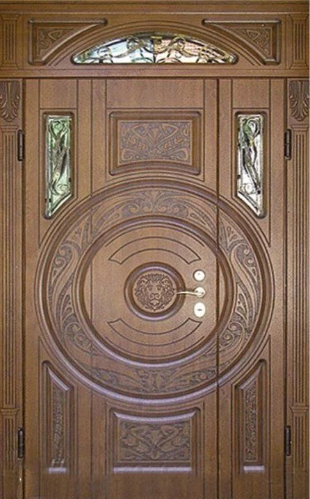 Поскольку в большинстве случаев устанавливаемые на входе в коттедж двустворчатые двери являются еще и предметом интерьера, украшающим здание, их дизайну предается особое значение. Эти двери, как правило, отделываются атмосферостойким МДФ, натуральным шпоном, массивом. Эффектно на таких дверях смотрится витражный узор, применение ковки, зеркальных элементов. Вариантов декора входной двустворчатой двери масса, тут все зависит от пожеланий заказчика.