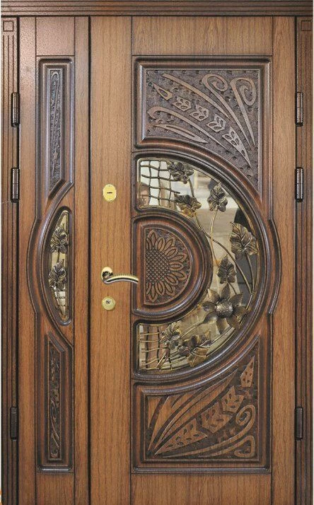 Поскольку в большинстве случаев устанавливаемые на входе в коттедж двустворчатые двери являются еще и предметом интерьера, украшающим здание, их дизайну предается особое значение. Эти двери, как правило, отделываются атмосферостойким МДФ, натуральным шпоном, массивом. Эффектно на таких дверях смотрится витражный узор, применение ковки, зеркальных элементов. Вариантов декора входной двустворчатой двери масса, тут все зависит от пожеланий заказчика.