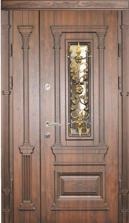Поскольку в большинстве случаев устанавливаемые на входе в коттедж двустворчатые двери являются еще и предметом интерьера, украшающим здание, их дизайну предается особое значение. Эти двери, как правило, отделываются атмосферостойким МДФ, натуральным шпоном, массивом. Эффектно на таких дверях смотрится витражный узор, применение ковки, зеркальных элементов. Вариантов декора входной двустворчатой двери масса, тут все зависит от пожеланий заказчика.