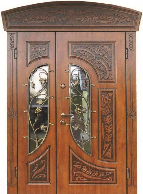 Поскольку в большинстве случаев устанавливаемые на входе в коттедж двустворчатые двери являются еще и предметом интерьера, украшающим здание, их дизайну предается особое значение. Эти двери, как правило, отделываются атмосферостойким МДФ, натуральным шпоном, массивом. Эффектно на таких дверях смотрится витражный узор, применение ковки, зеркальных элементов. Вариантов декора входной двустворчатой двери масса, тут все зависит от пожеланий заказчика.