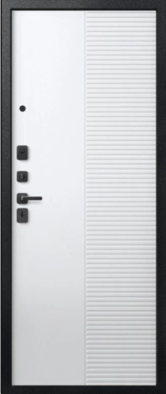 Надежная входная Дверь V-18 Черный муар + Кашемир графит - Кашемир Белый премиум класса по цене 46 545 руб. Большая толщина стали защитит от проникновения в ваш дом, квартиру или коттедж. Используется очень качественная фурнитура: замки, цилиндры, ручки, защелки. Покрытие и отделка двери изготовлено под внимательным контролем производителя. Дверь имеет долгий срок службы и гарантию.
